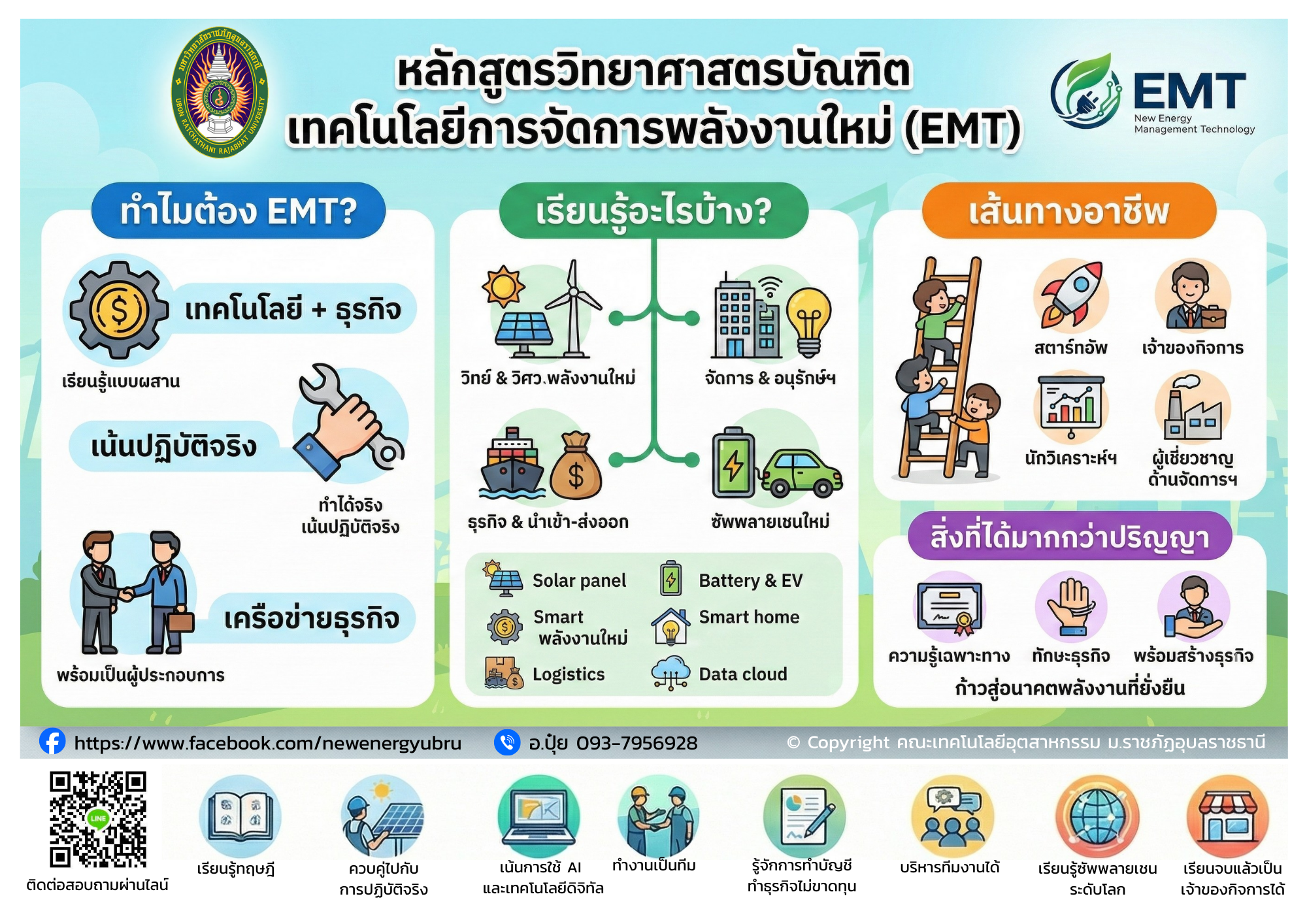 สาขาวิชาเทคโนโลยีการจัดการพลังงานใหม่ สนใจสมัครเรียนติดต่อ อ.ปุ๋ย 0937956928 https://www.facebook.com/newenergyubru https://ind-tech.ubru.ac.th/news/ https://emt.ubru.ac.th/ https://69463f3102f29.site123.m คณะเทคโนโลยีอุตสาหกรรม มหาวิทยาลัยราชภัฏอุบลราชธานี https://maps.app.goo.gl/CtzvLKvqaQLq6RzQ8